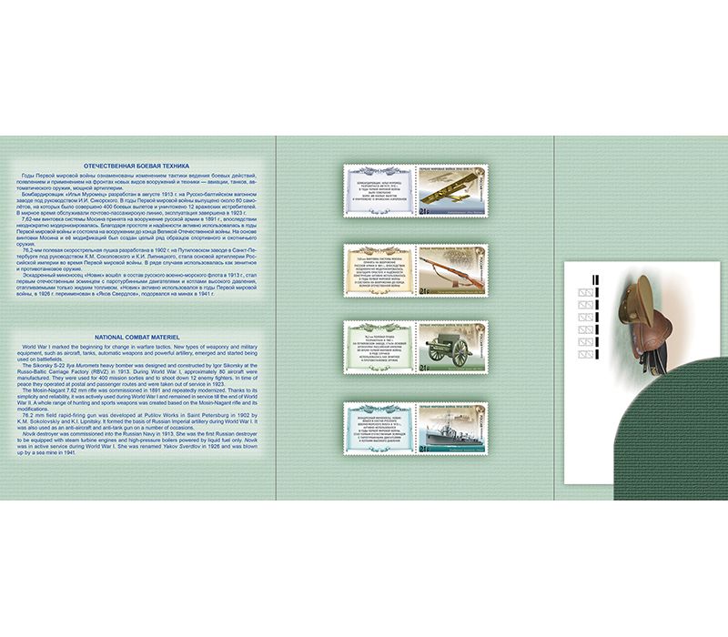 Сувенирный набор в художественной обложке «История Первой мировой войны. Отечественная боевая техника», выпущенный в 2015 году. Обложка трехстворчатая, размер в сложенном виде: 190×260 мм. Внутри обложки — четыре почтовые марки, конверты первого дня с гашением.