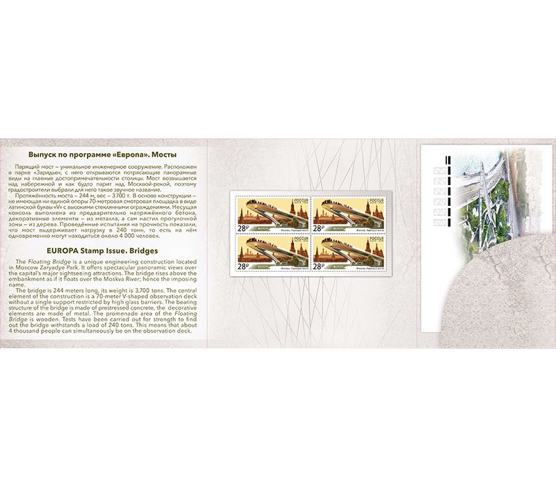 Сувенирный набор в художественной обложке.Обложка трехстворчатая, размер в сложенном виде: 180×180 мм. Внутри обложки — 4 марки, конверт первого дня с гашением.
