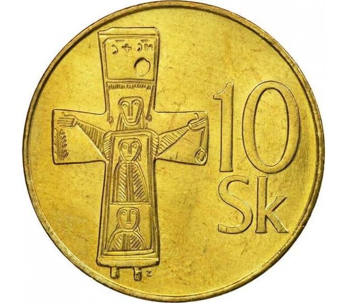 Монета регулярного чекана номиналом 10 крон 1994 года, выпущенная в Словакии. На лицевой стороне монеты указан ее номинал, а также нанесено рельефное изображение креста.